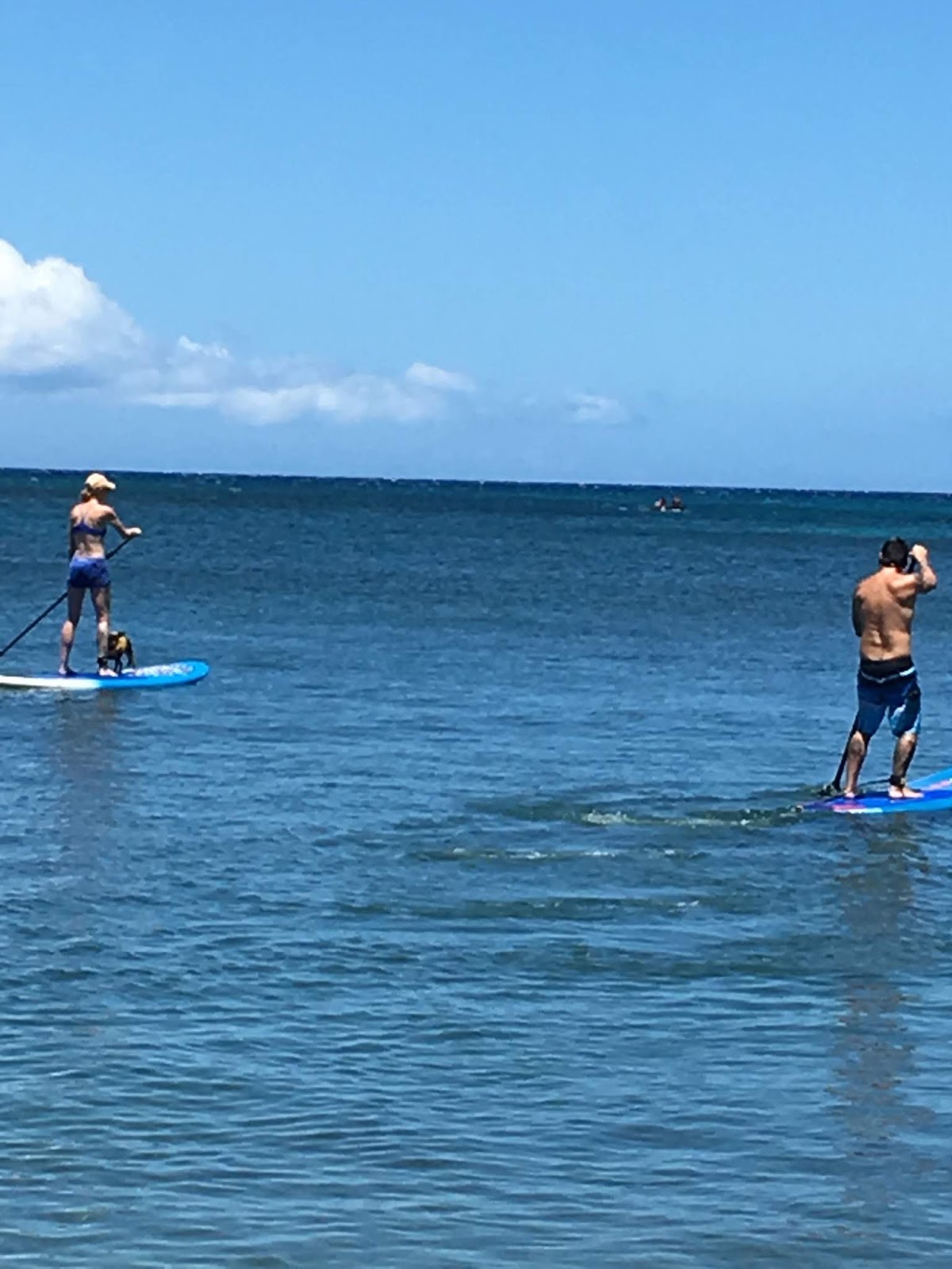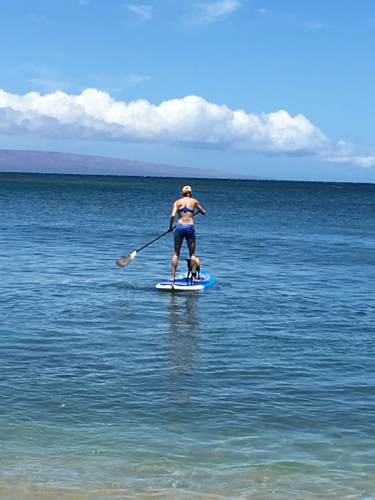 Devo is learning how to paddle board. Although Devo is not a huge fan of the water, he does enjoy being with mom. To get him used to how the paddle board works, we have taken him out a calm day. I am teaching him where to stay on the board and when it is okay for him to jump off and swim to shore (and when it is not). Today we are doing some basic foot moves and turns to get him used to the movements of the paddle board. Remember to always use a dog life vest for safety.
