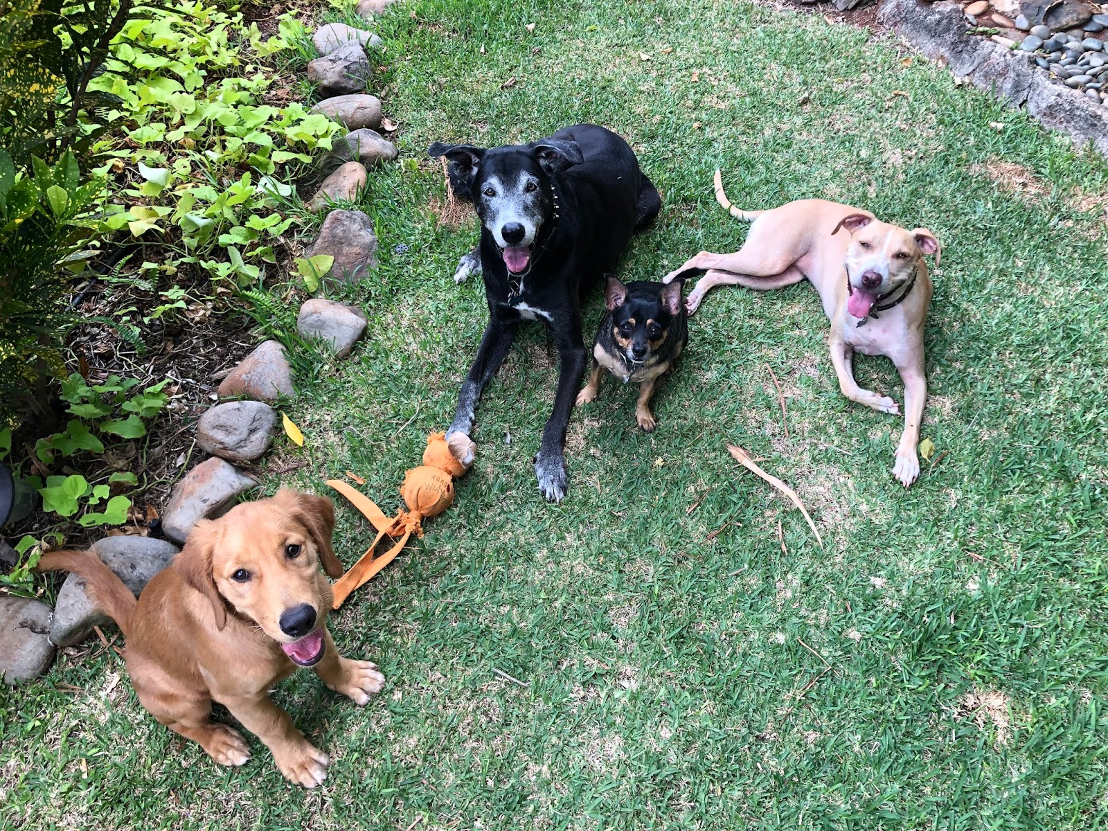 Ahsoka and Brady playing with some tree foliage.