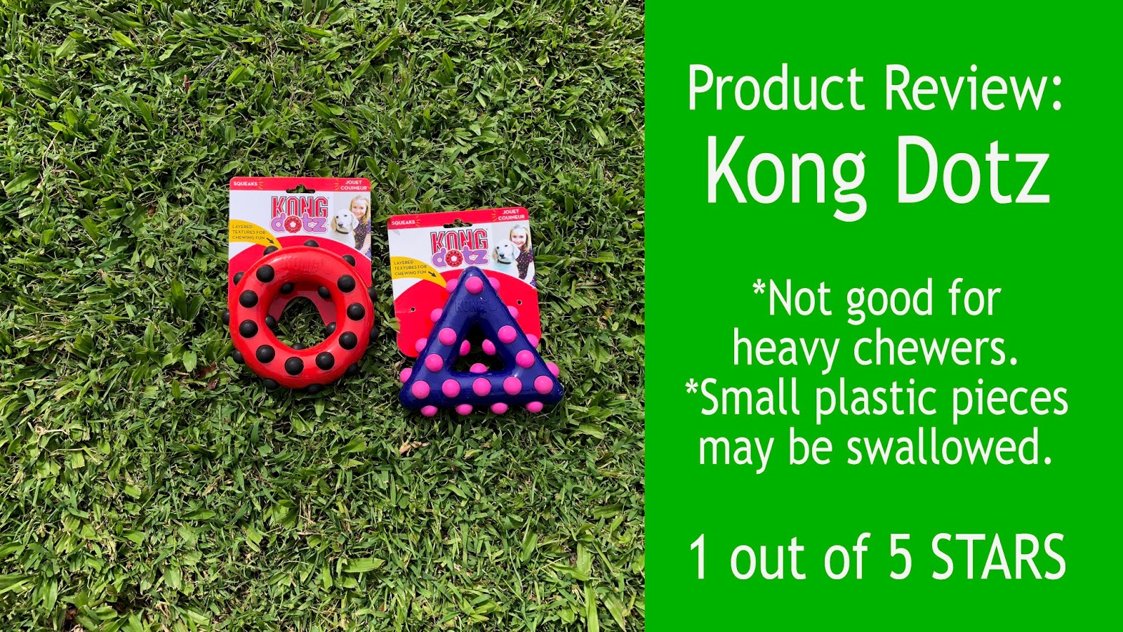 Although I do like many Kong toys, unfortunately the Kong Dotz is not one of them.  This is as product I can not recommend.  I thought at first that this toy would hold up to heavy chewing, it does not.  Plus, once your dog really gets into chewing this toy, it starts coming apart in very small pieces.  This is not a good thing as these pieces may be swallowed by your dog.  I did find a few pieces of the Kong Dotz in Ahsoka’s poop.  This is really bad.  The plastic this toy is made of is definitely NOT something we want passing through our dog’s body.  If the piece is large enough, it may get stuck and become an obstruction requiring surgery for your dog.  Obviously this is not something any of us want.  Therefore I must give the Kong Dotz toy a 1 our of 5 STARS.  I do not recommend this product for your dog.