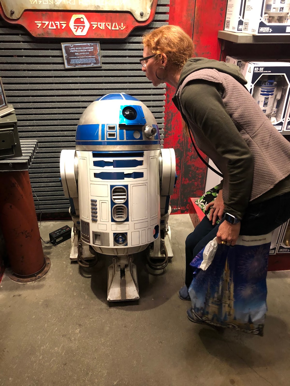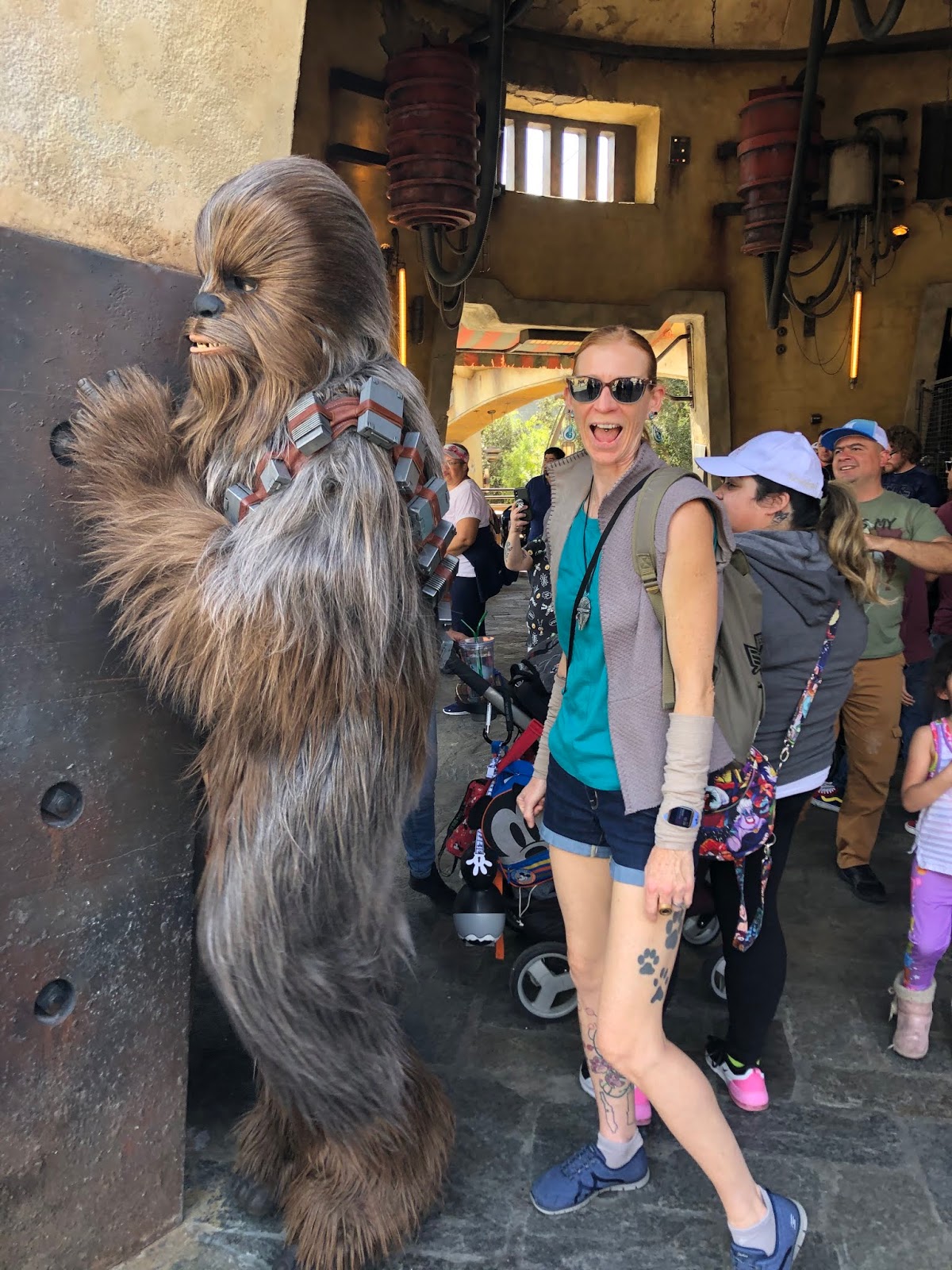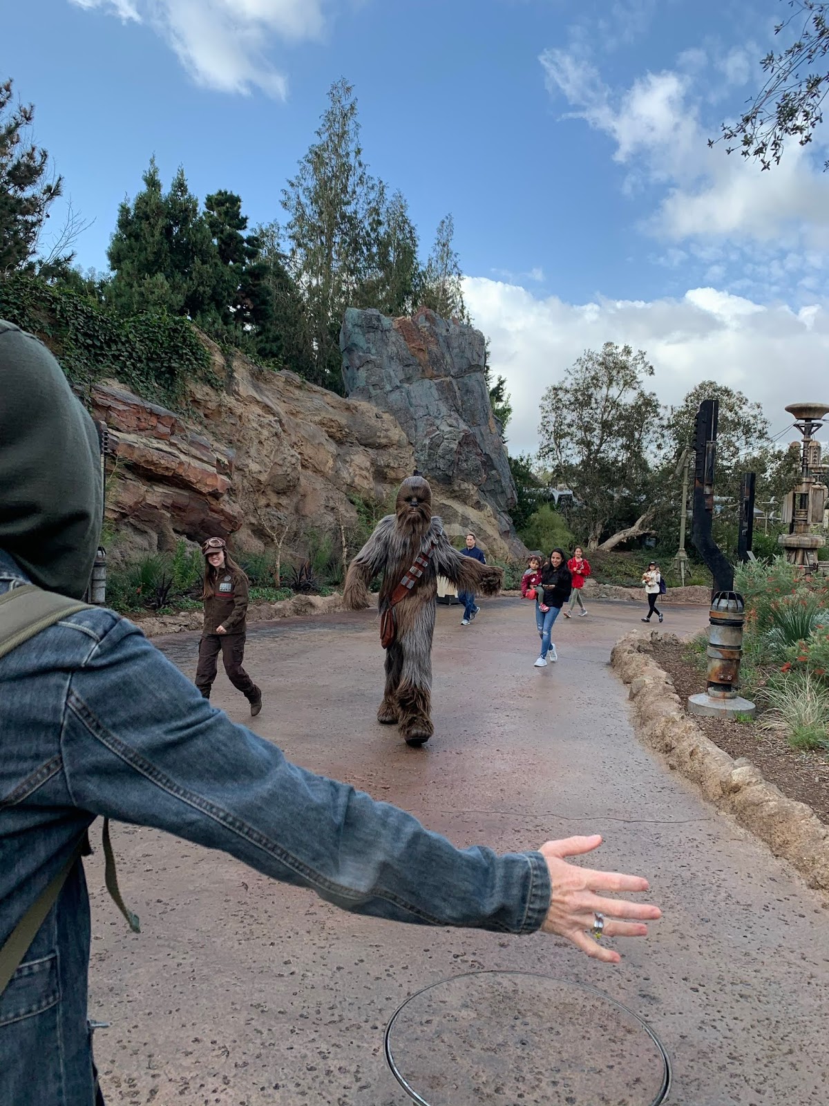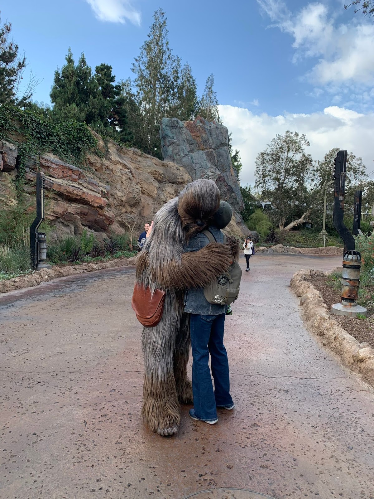 As part of the Galaxy’s Edge experience, there is an Ap you can get on your phone and it allows you to hack all kinds of equipment (amongst other things). Here you see Adam helping Chewbacca by hacking something for him. Chewy comes to hug him, and then points to his shirt (a Star Wars shirt that said “Join the Empire”). Chewy did not approve, but it’s just a disguise.
