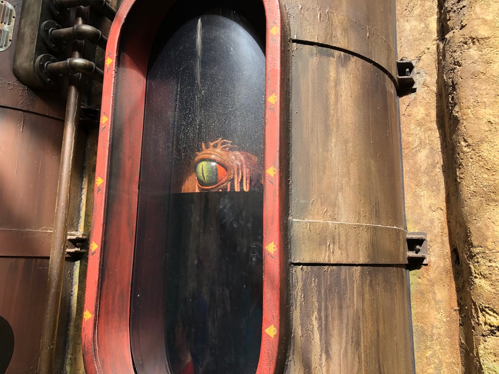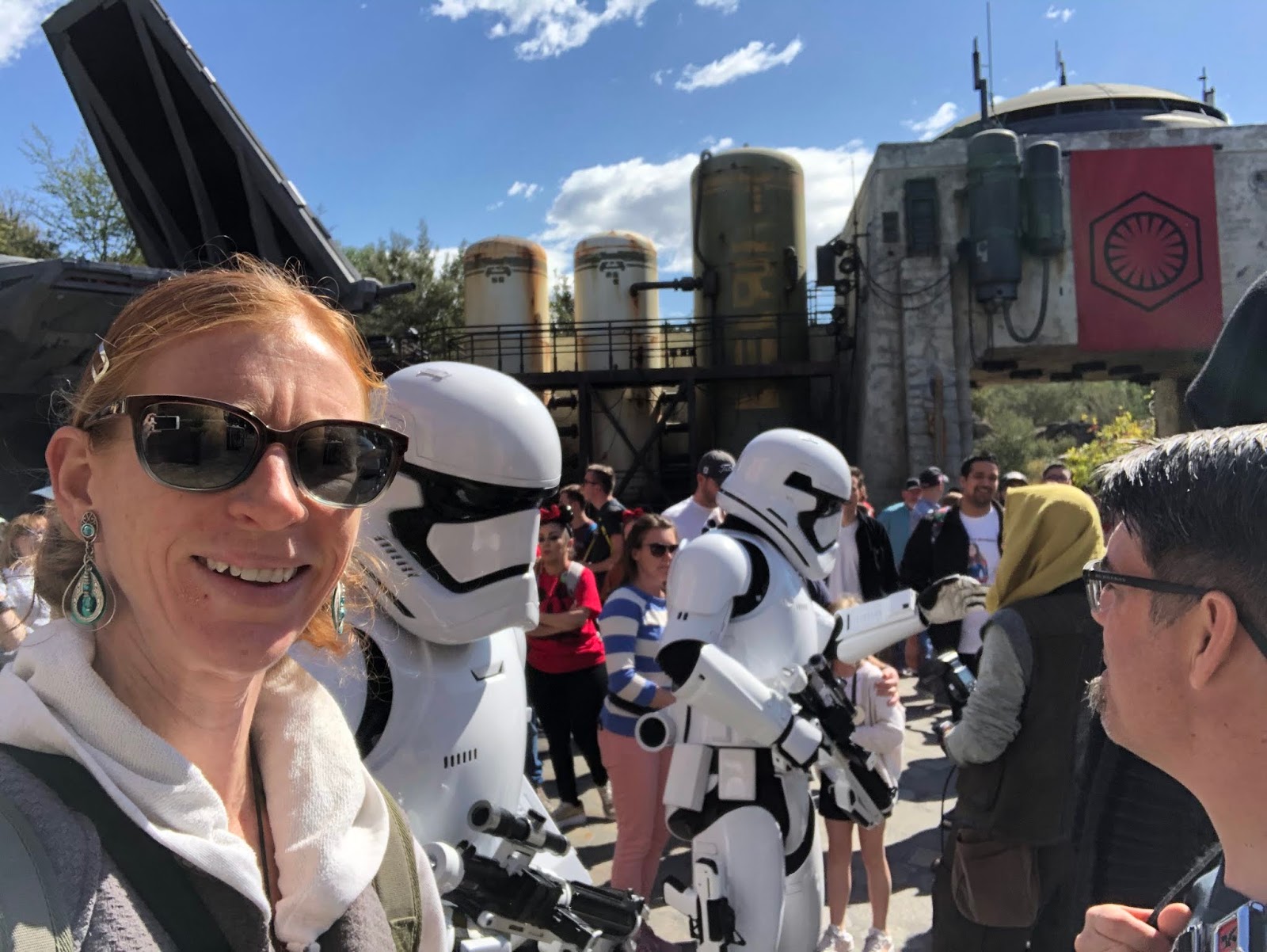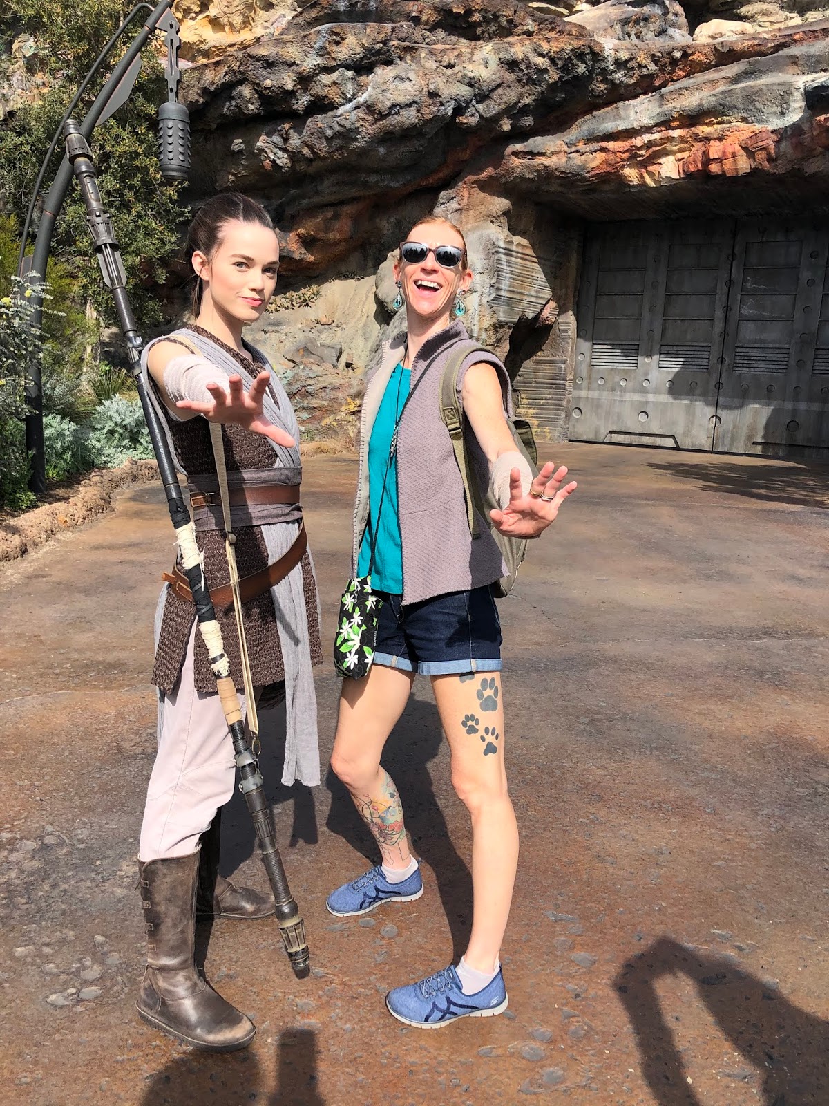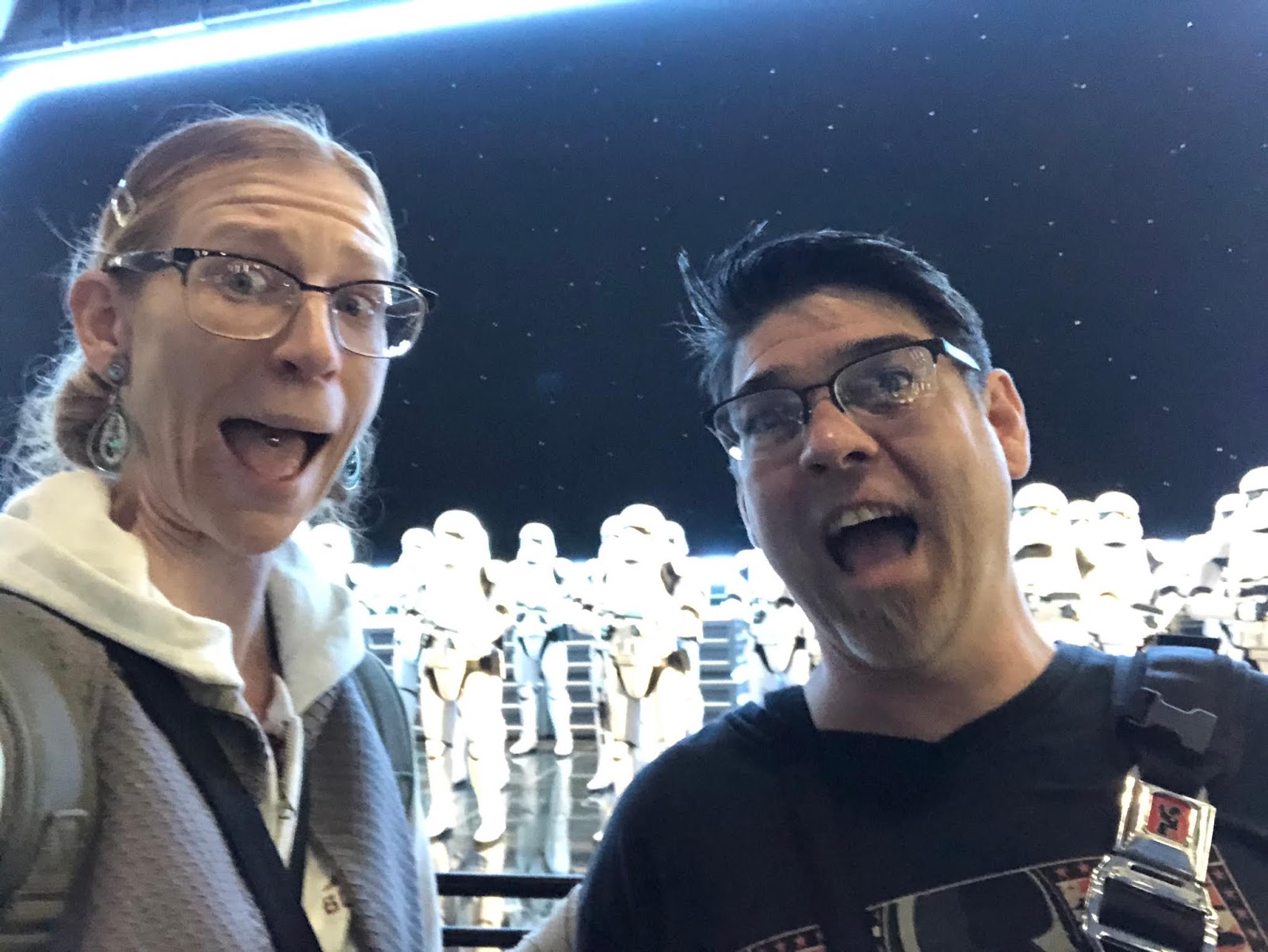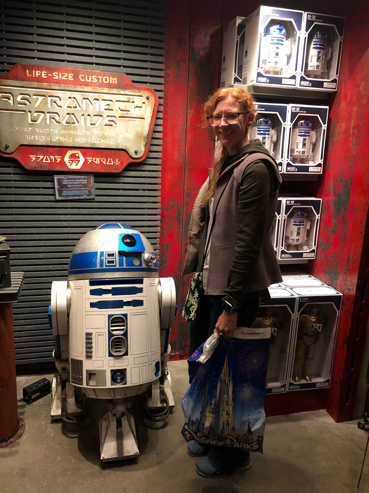 As part of the Galaxy’s Edge experience, there is an Ap you can get on your phone and it allows you to hack all kinds of equipment (amongst other things). Here you see Adam helping Chewbacca by hacking something for him. Chewy comes to hug him, and then points to his shirt (a Star Wars shirt that said “Join the Empire”). Chewy did not approve, but it’s just a disguise.