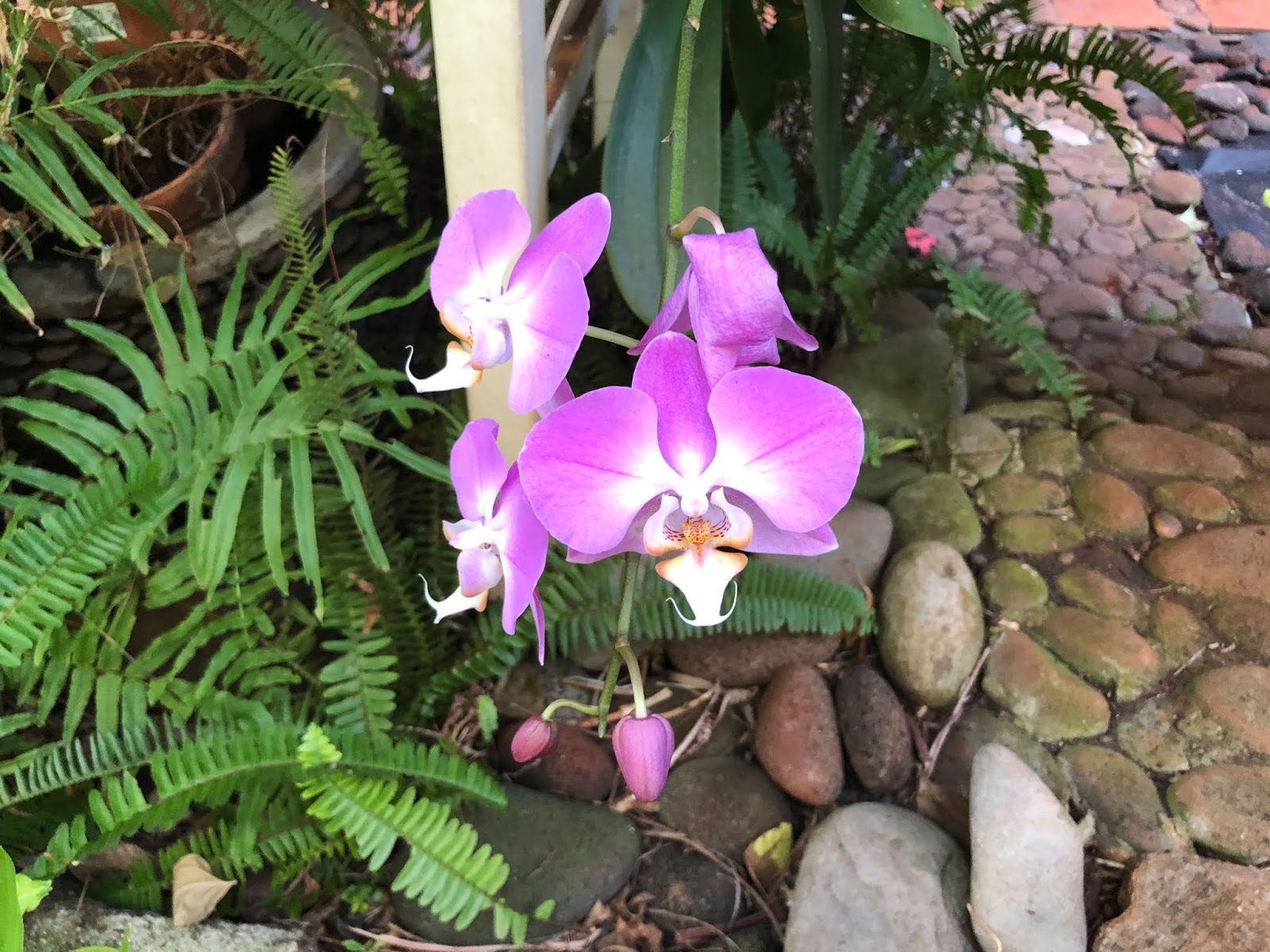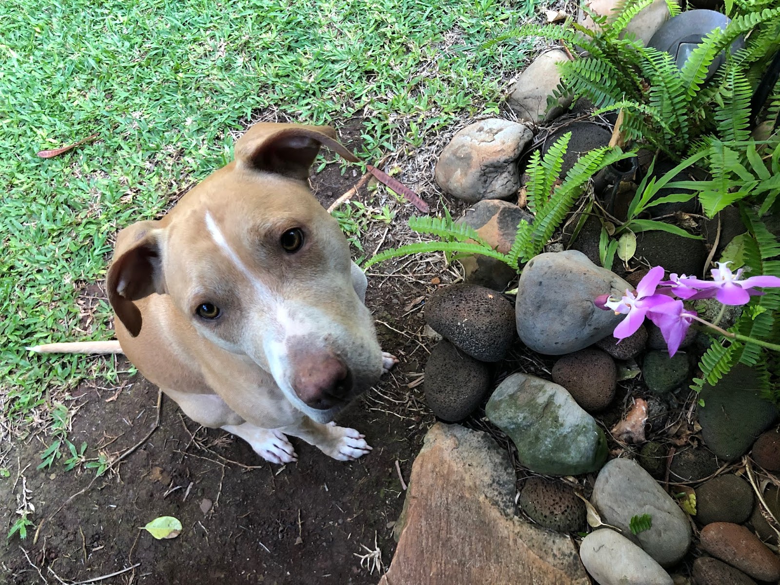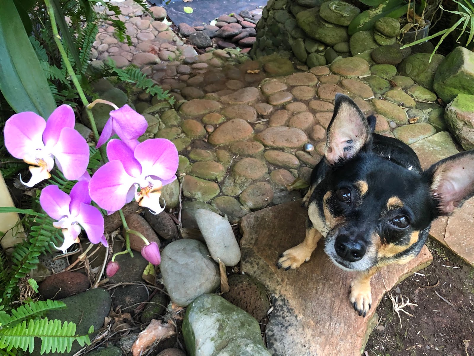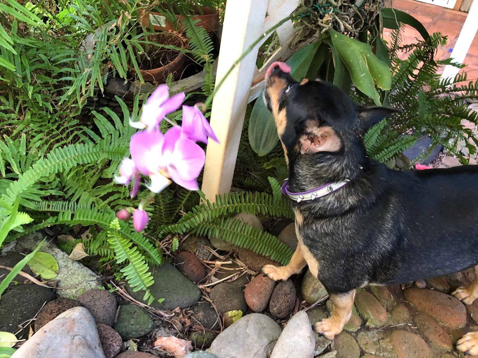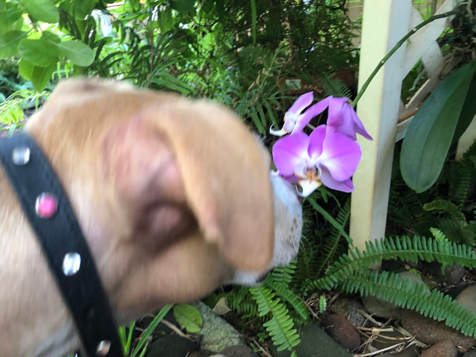 I tried to do a photo shoot with the dogs and a beautiful orchid in our yard.