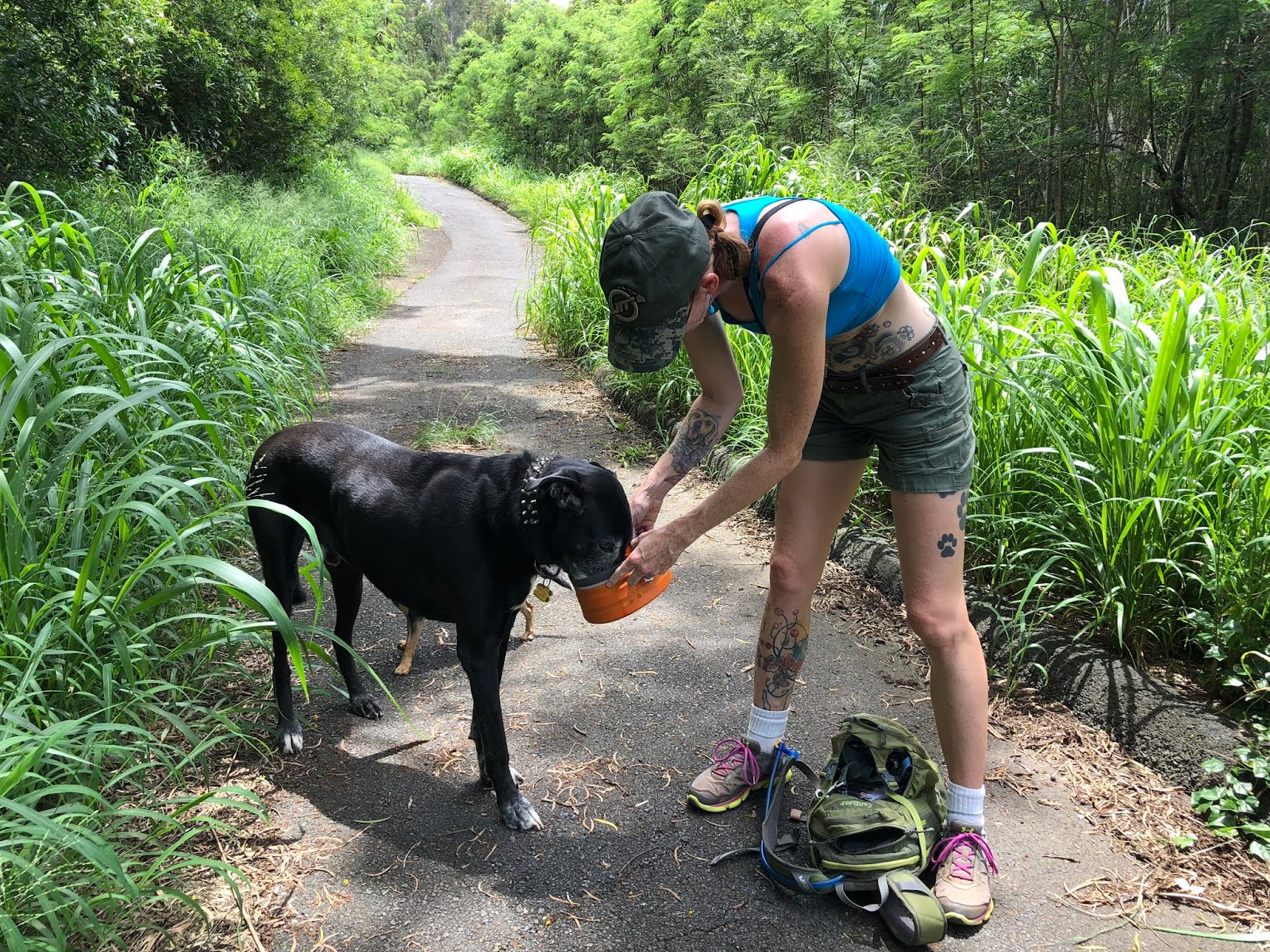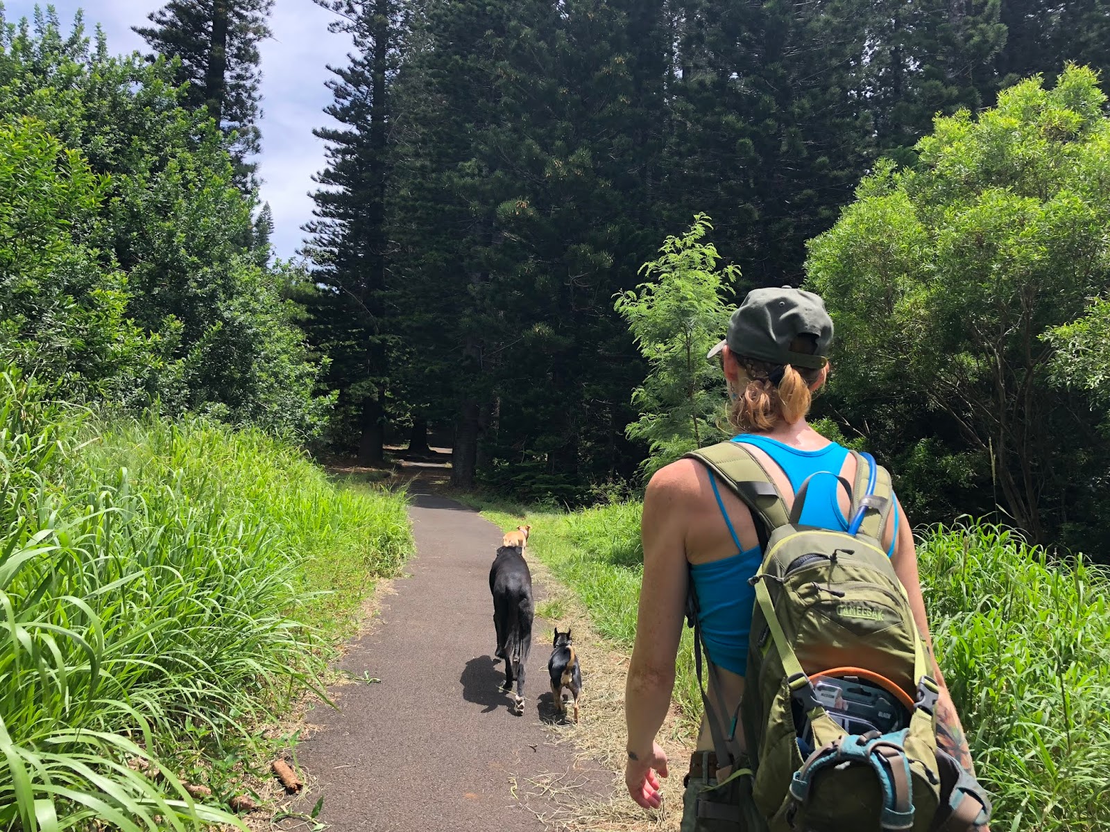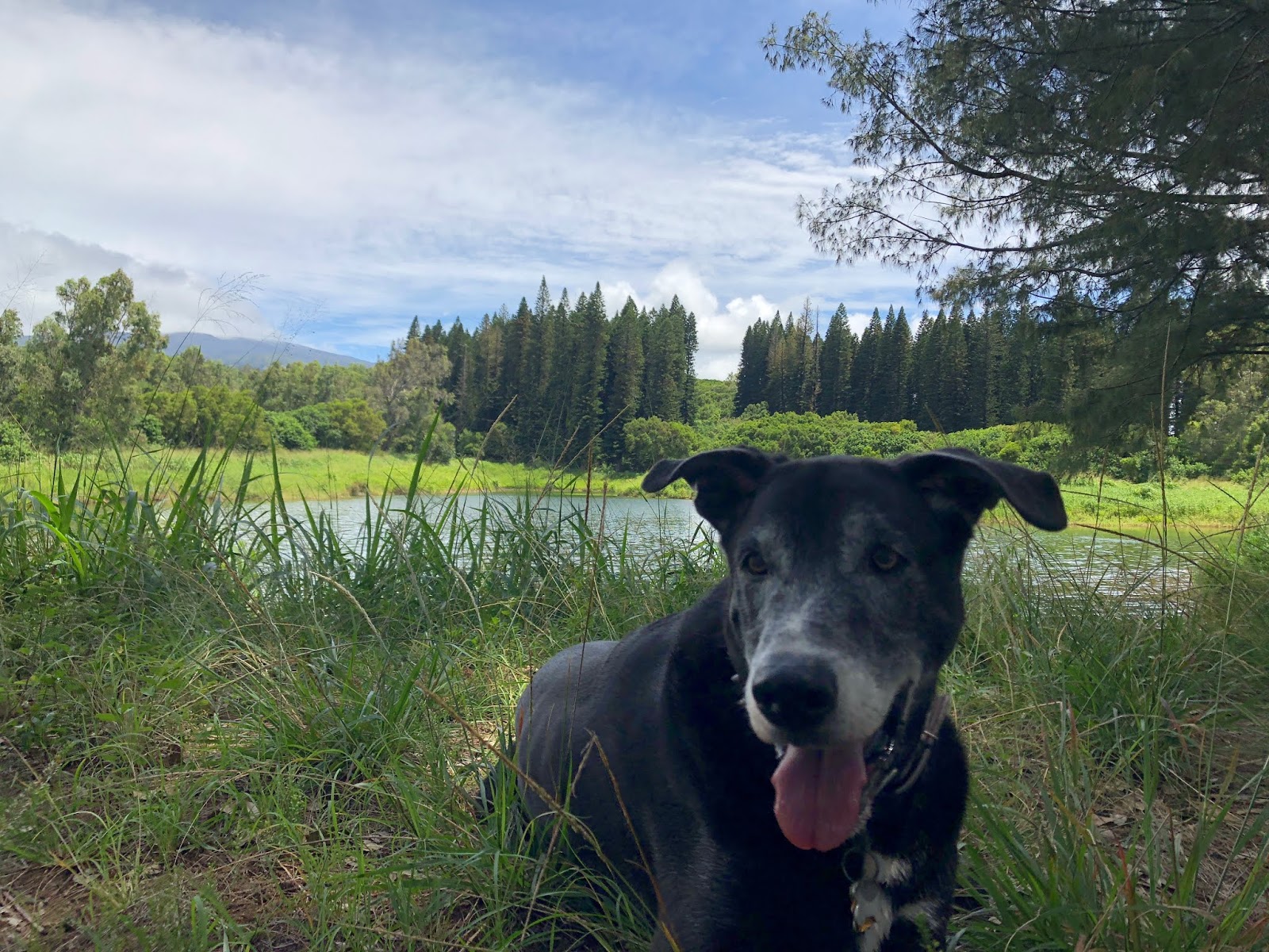 Caravaggio swimming in the pond at the top of the Village Trails in Kapalua.
